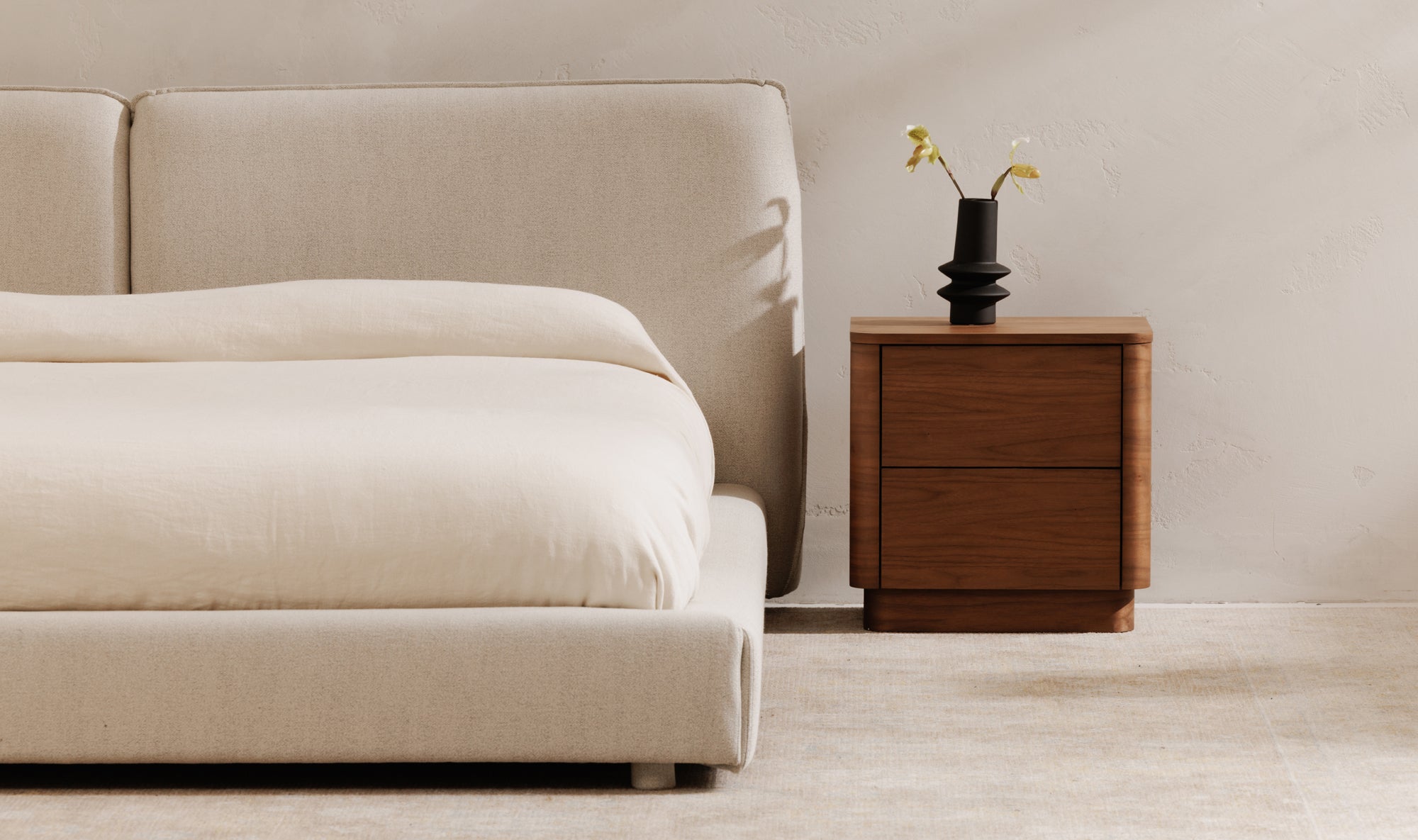 Featuring a low-slung, 70’s inspired silhouette, the Float bed’s comfort-driven intention features gentle curves and a subtle floating base design that lends to a sense of weightlessness. Its linen-blend upholstery provides a refined texture, while the plump foam cushion headboard speaks to its softness and appeal.
