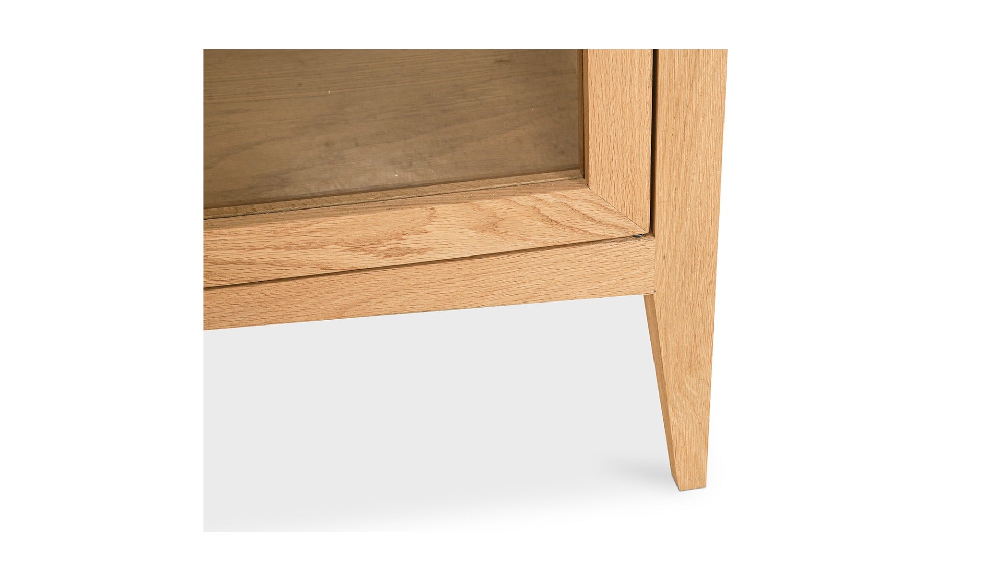 - Solid oak frame with oak veneer on plywood top, side & bottom with natural cane shelf, tempered glass shelves & doors