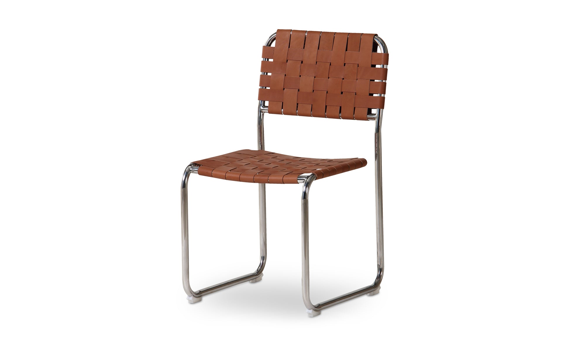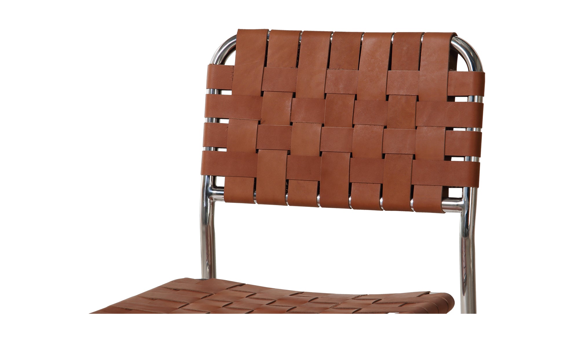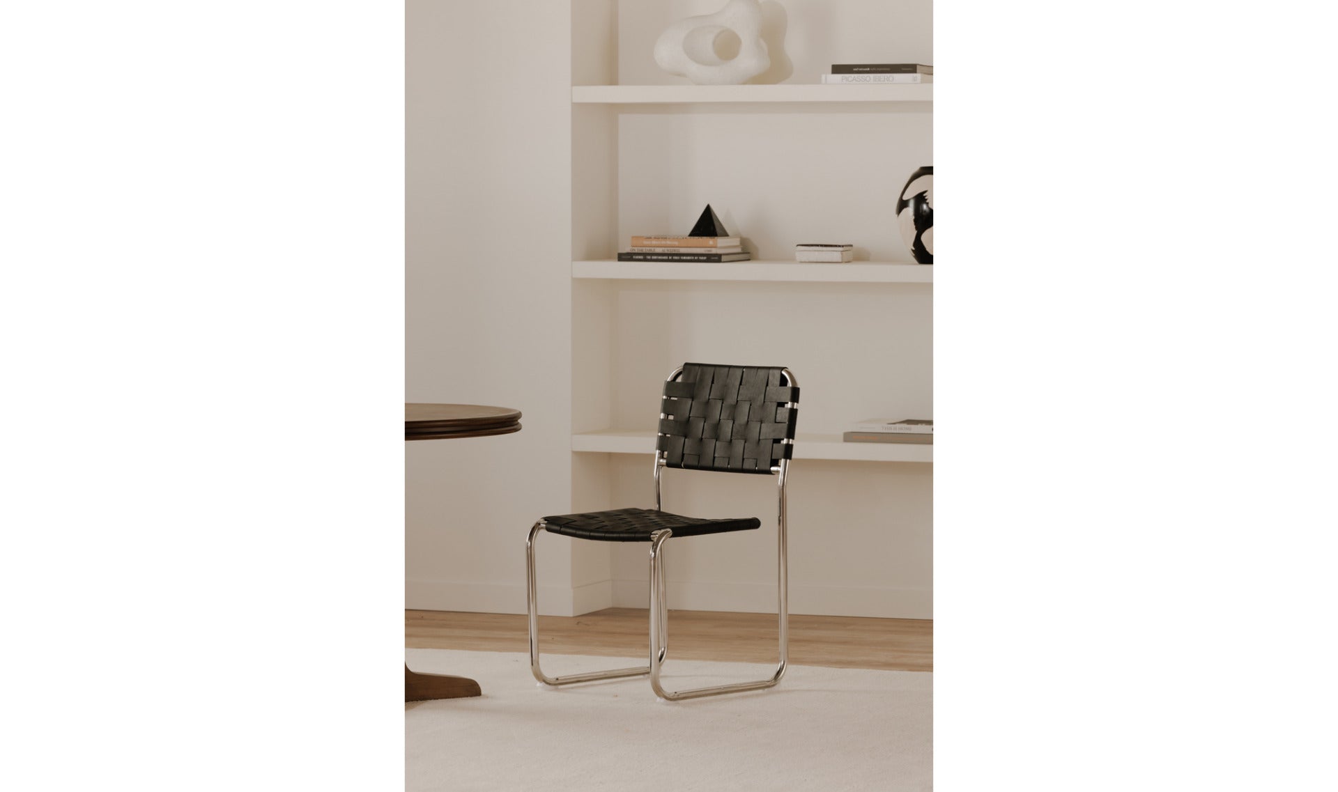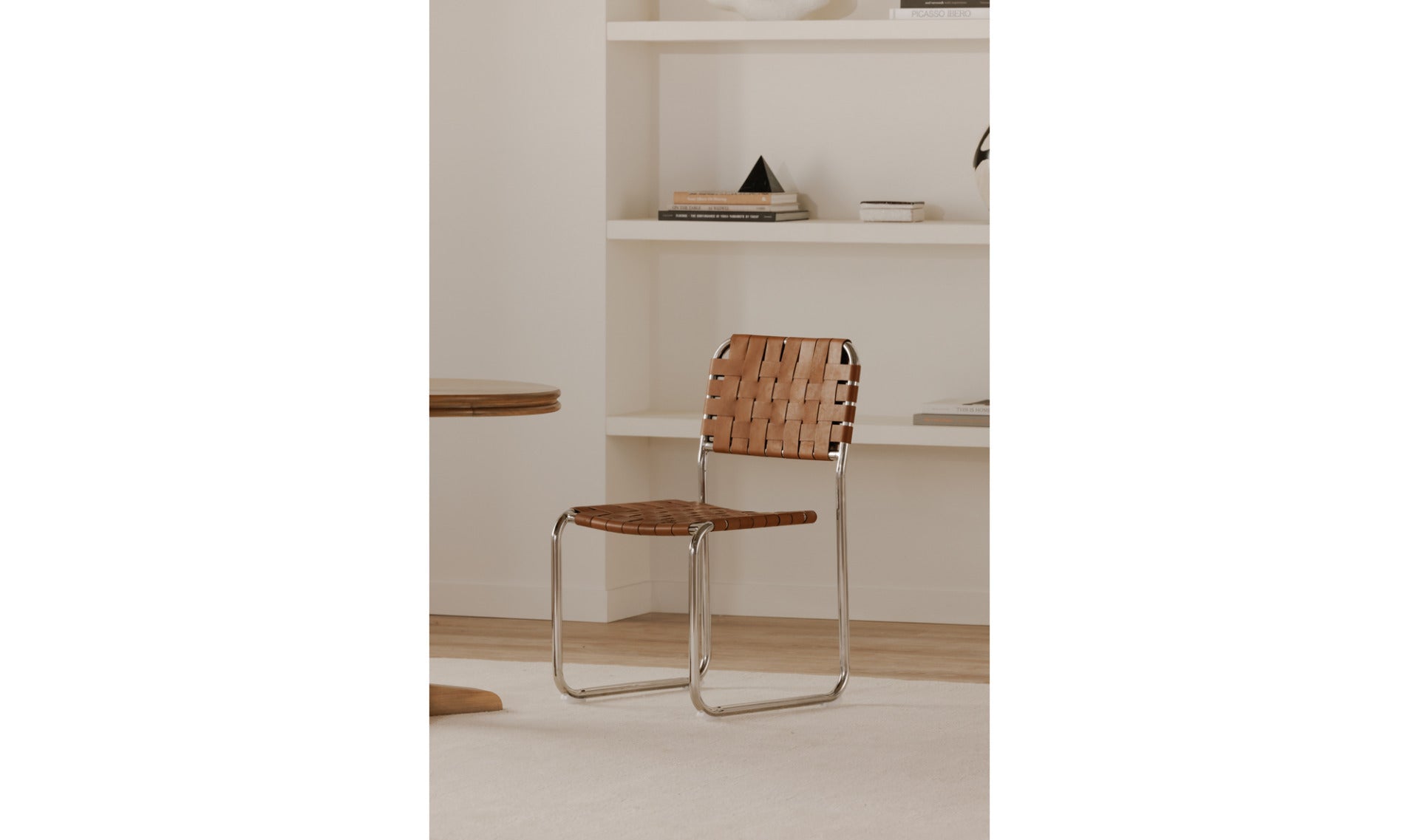 The Linea dining chair is a trend-forward piece blending handmade charm with industrial chic. It features a sturdy chrome iron frame, artistically complemented by handwoven leather straps in a classic basketweave pattern across the seat and back. The leather's rich texture against the sleek metal base and cut-out back adds visual depth, while a distinctive gap between the seat and back enhances its modern appeal.
