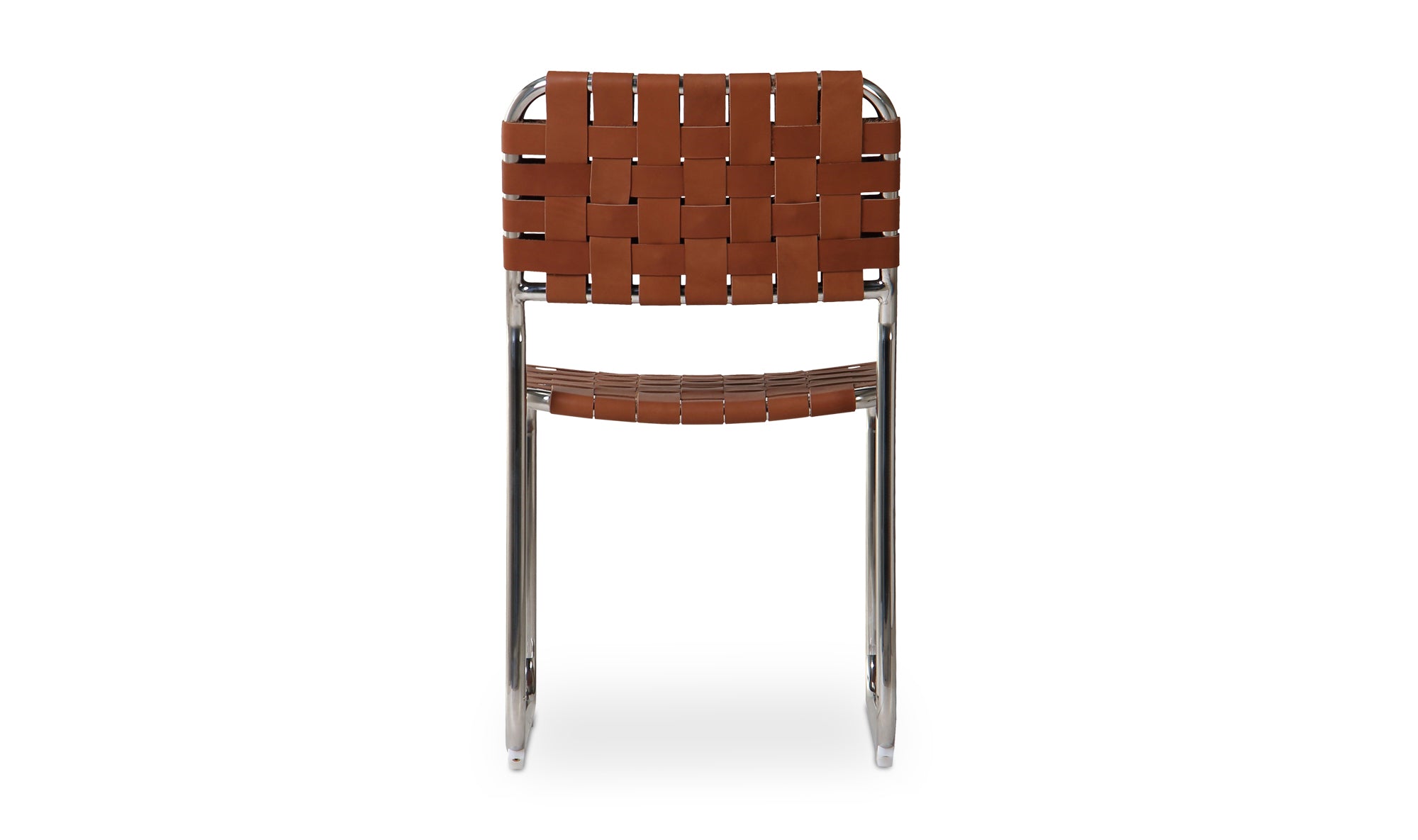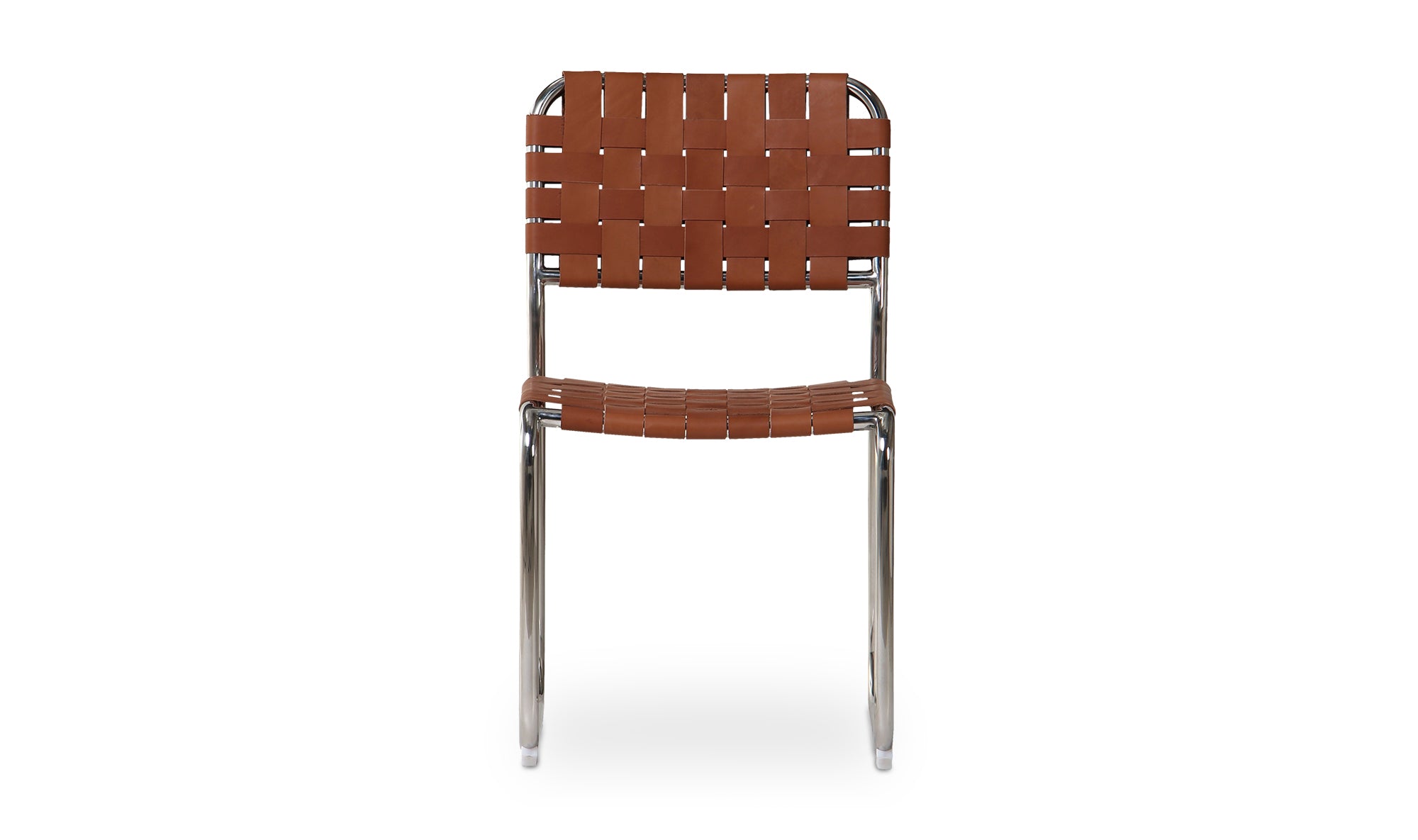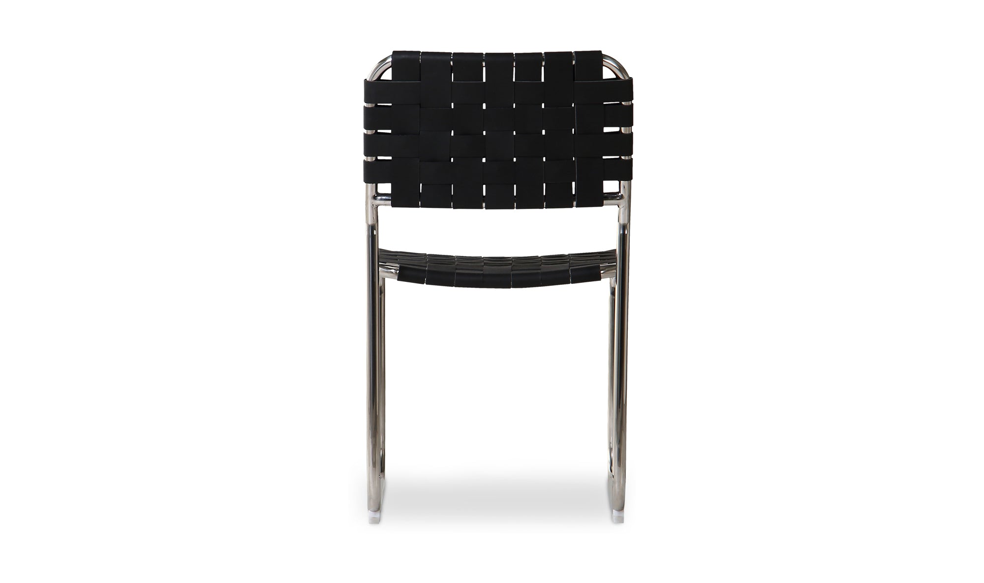 The Linea dining chair is a trend-forward piece blending handmade charm with industrial chic. It features a sturdy chrome iron frame, artistically complemented by handwoven leather straps in a classic basketweave pattern across the seat and back. The leather's rich texture against the sleek metal base and cut-out back adds visual depth, while a distinctive gap between the seat and back enhances its modern appeal.