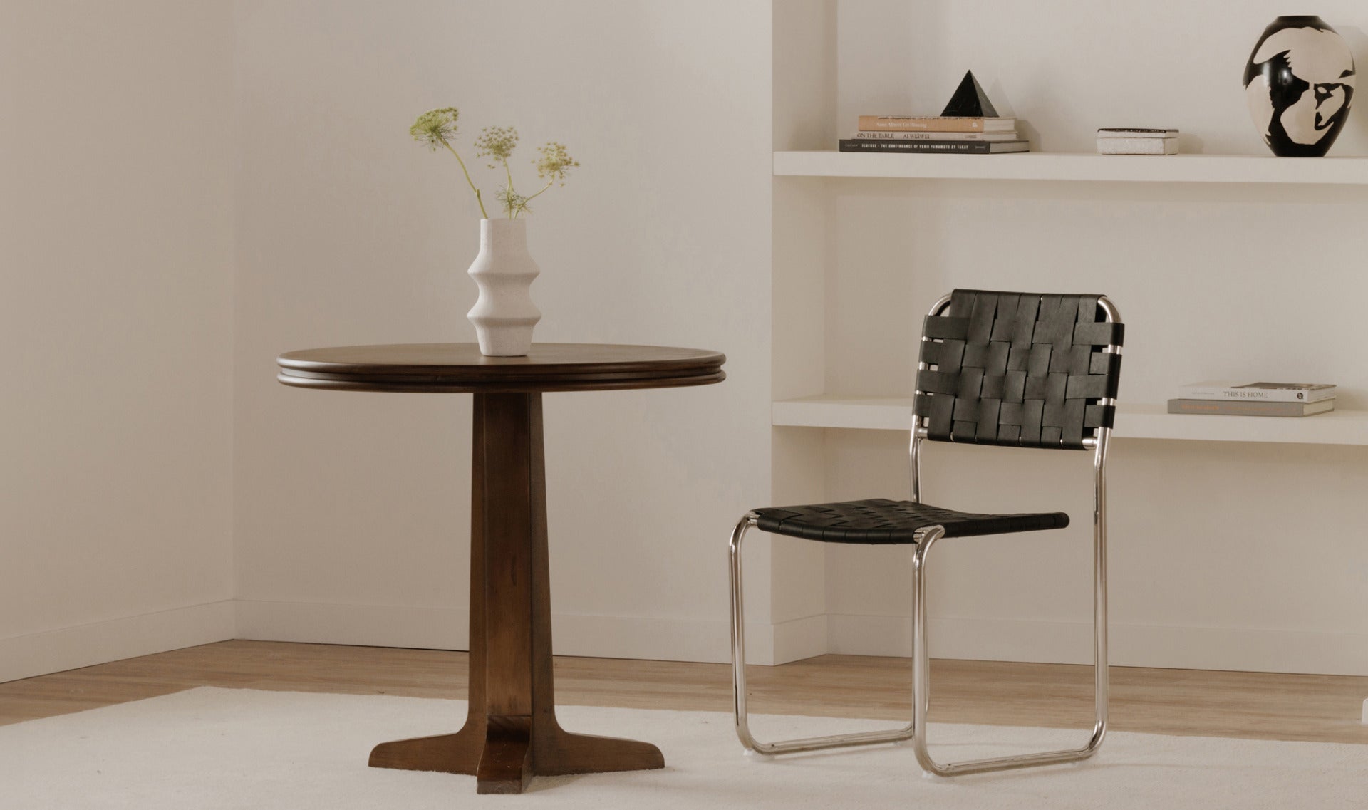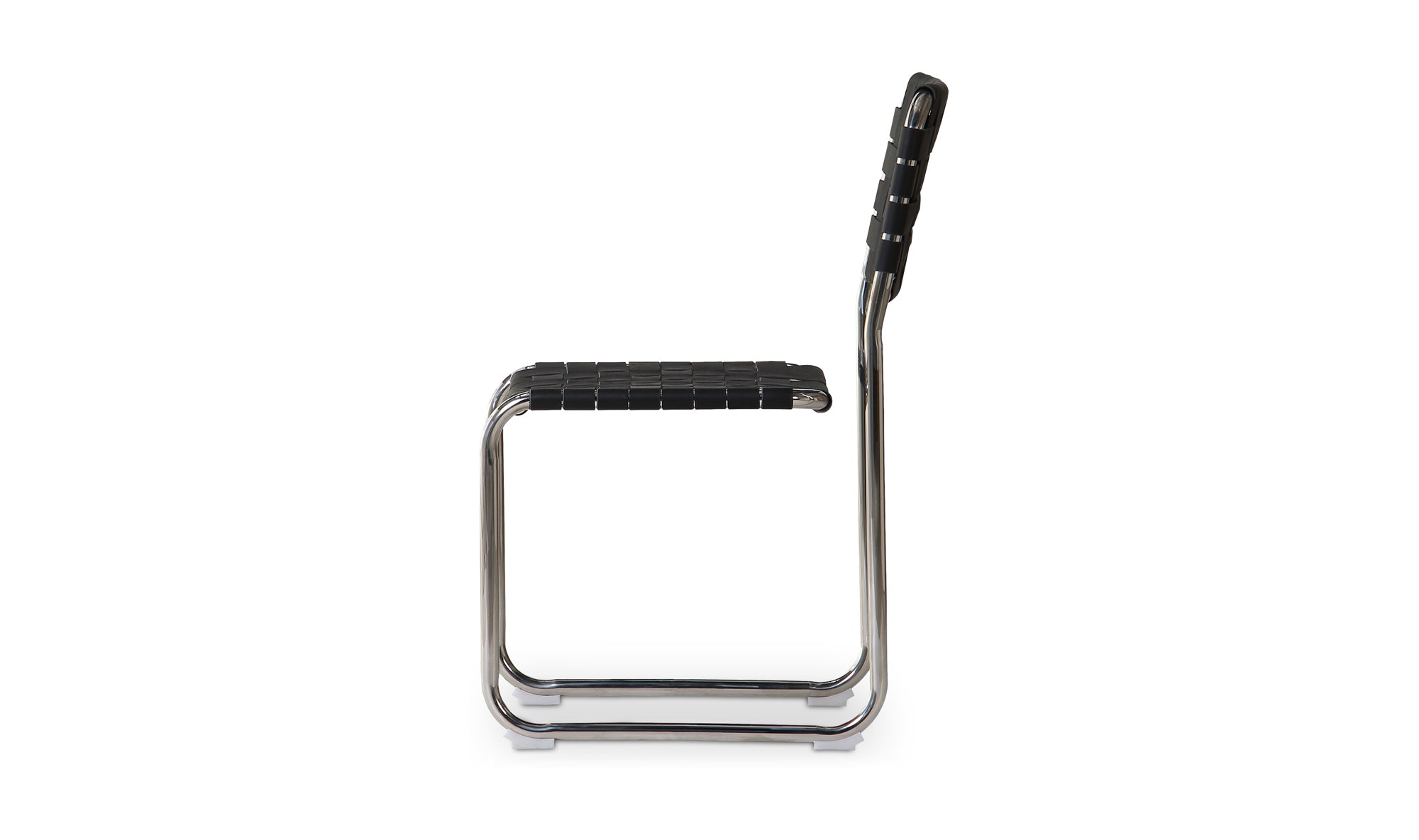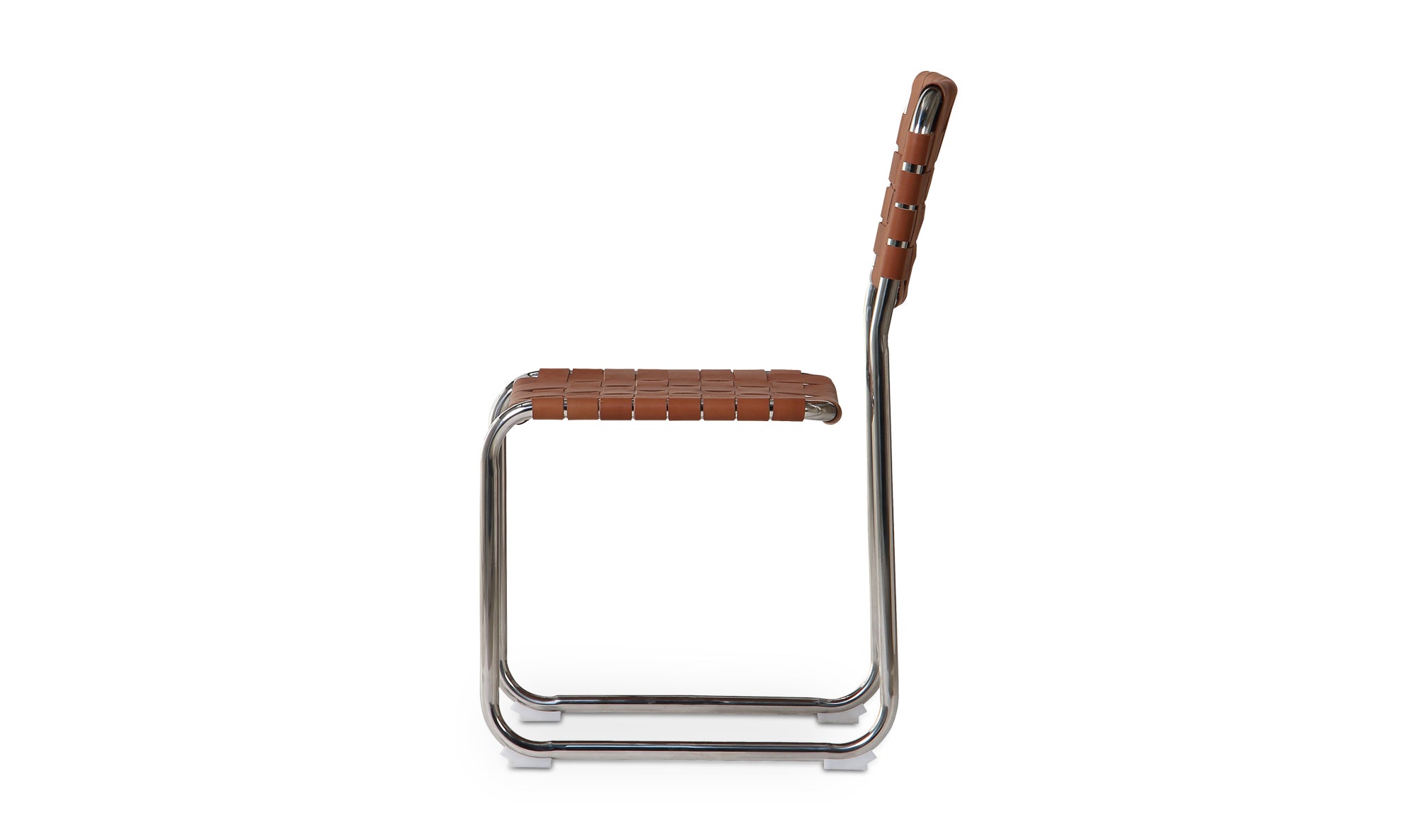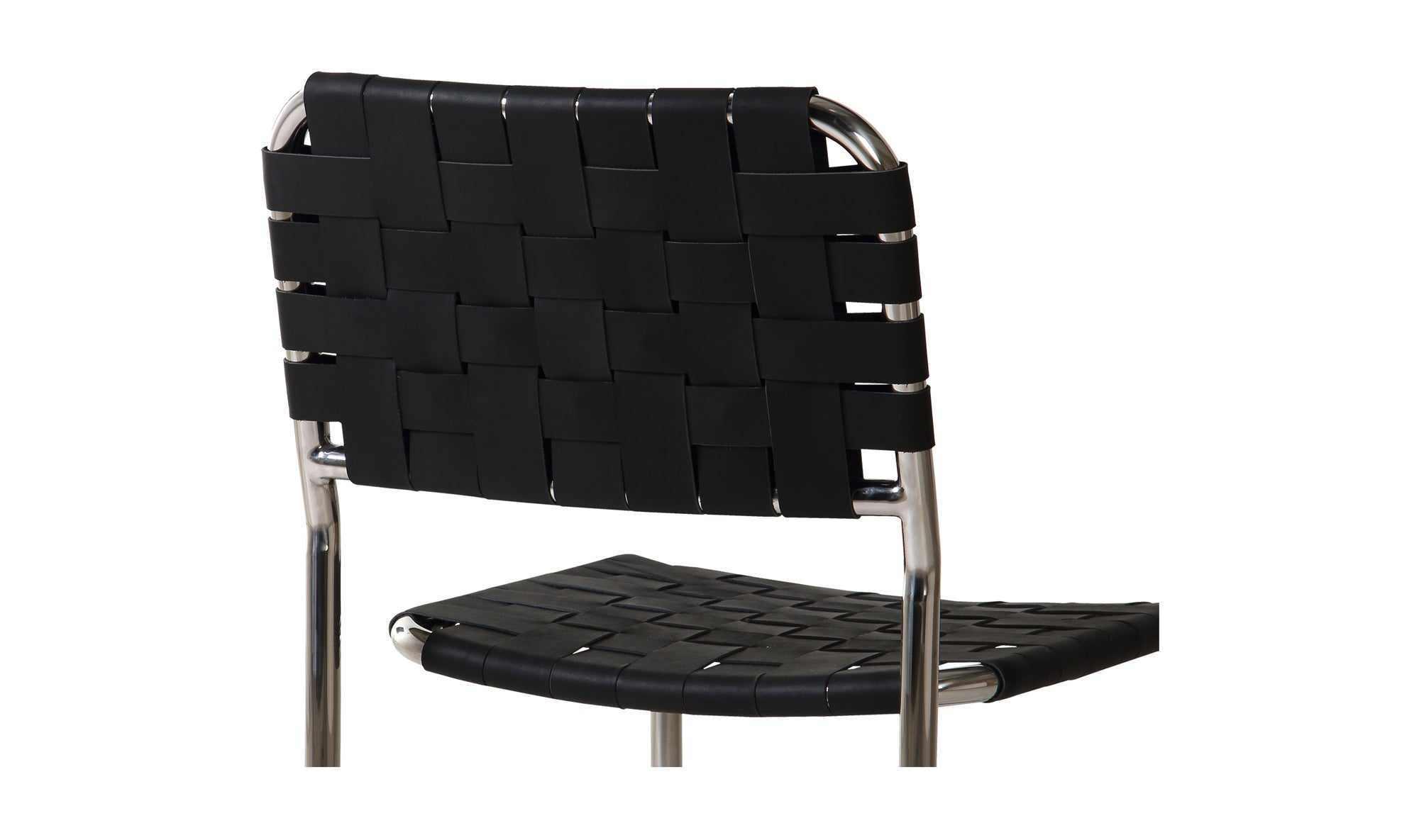The Linea dining chair is a trend-forward piece blending handmade charm with industrial chic. It features a sturdy chrome iron frame, artistically complemented by handwoven leather straps in a classic basketweave pattern across the seat and back. The leather's rich texture against the sleek metal base and cut-out back adds visual depth, while a distinctive gap between the seat and back enhances its modern appeal.