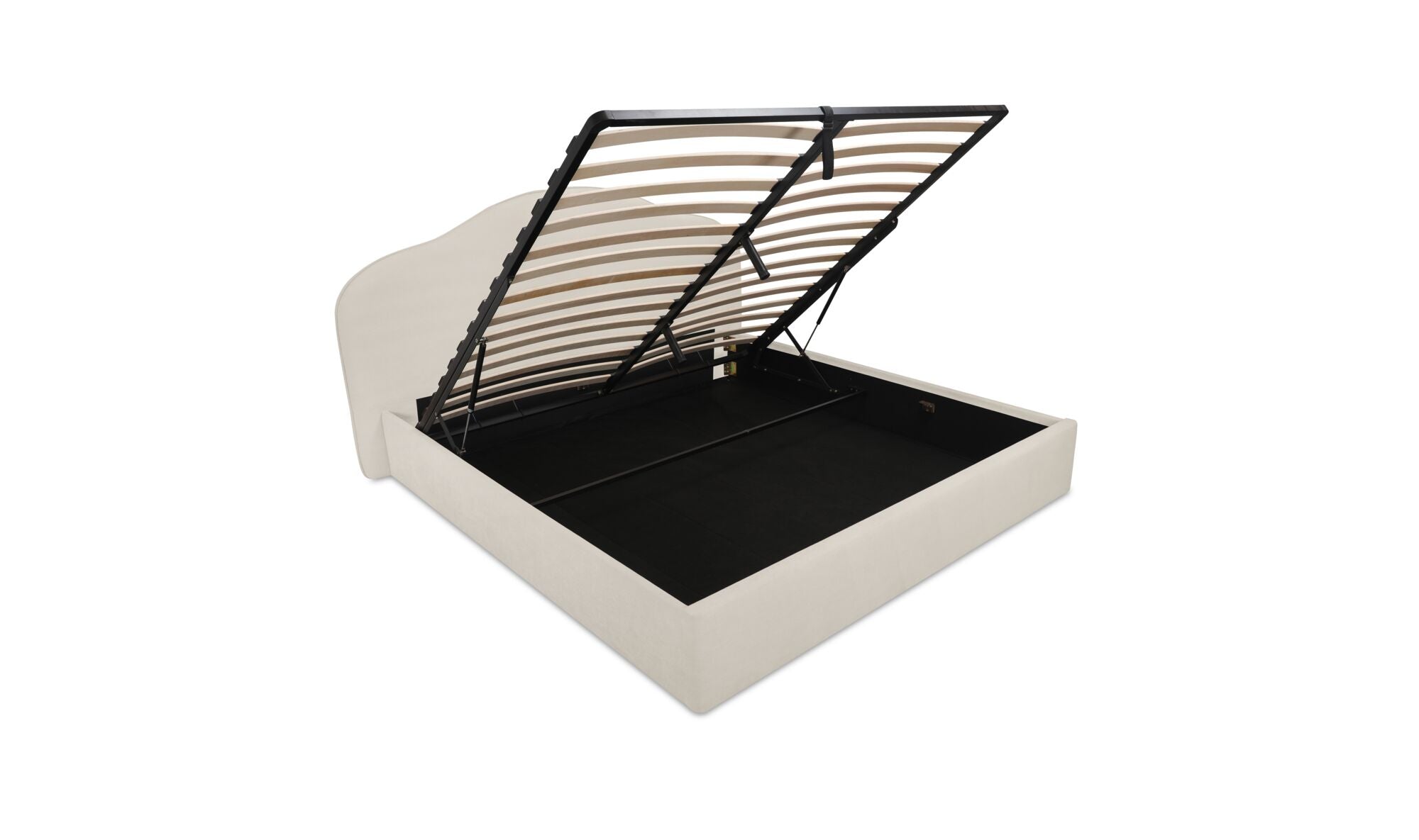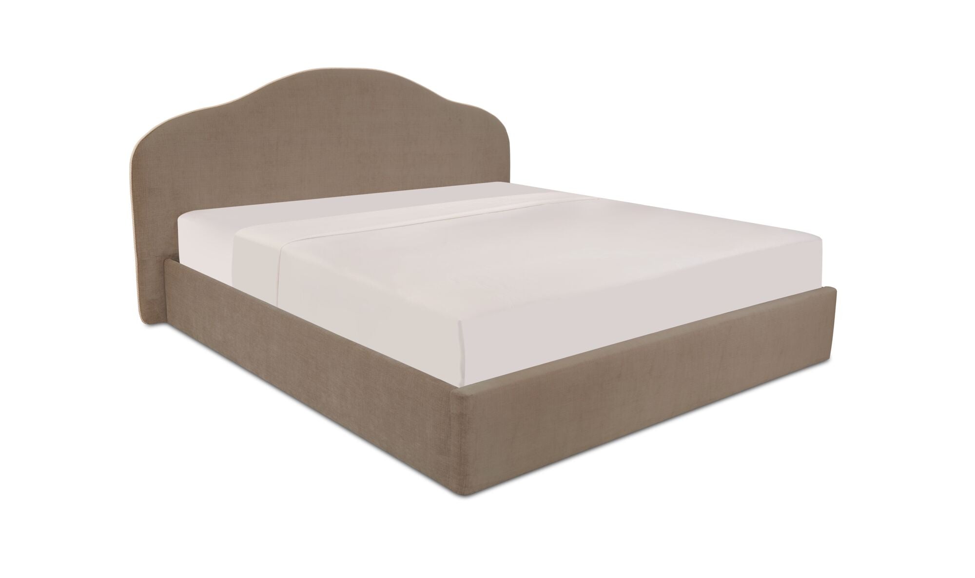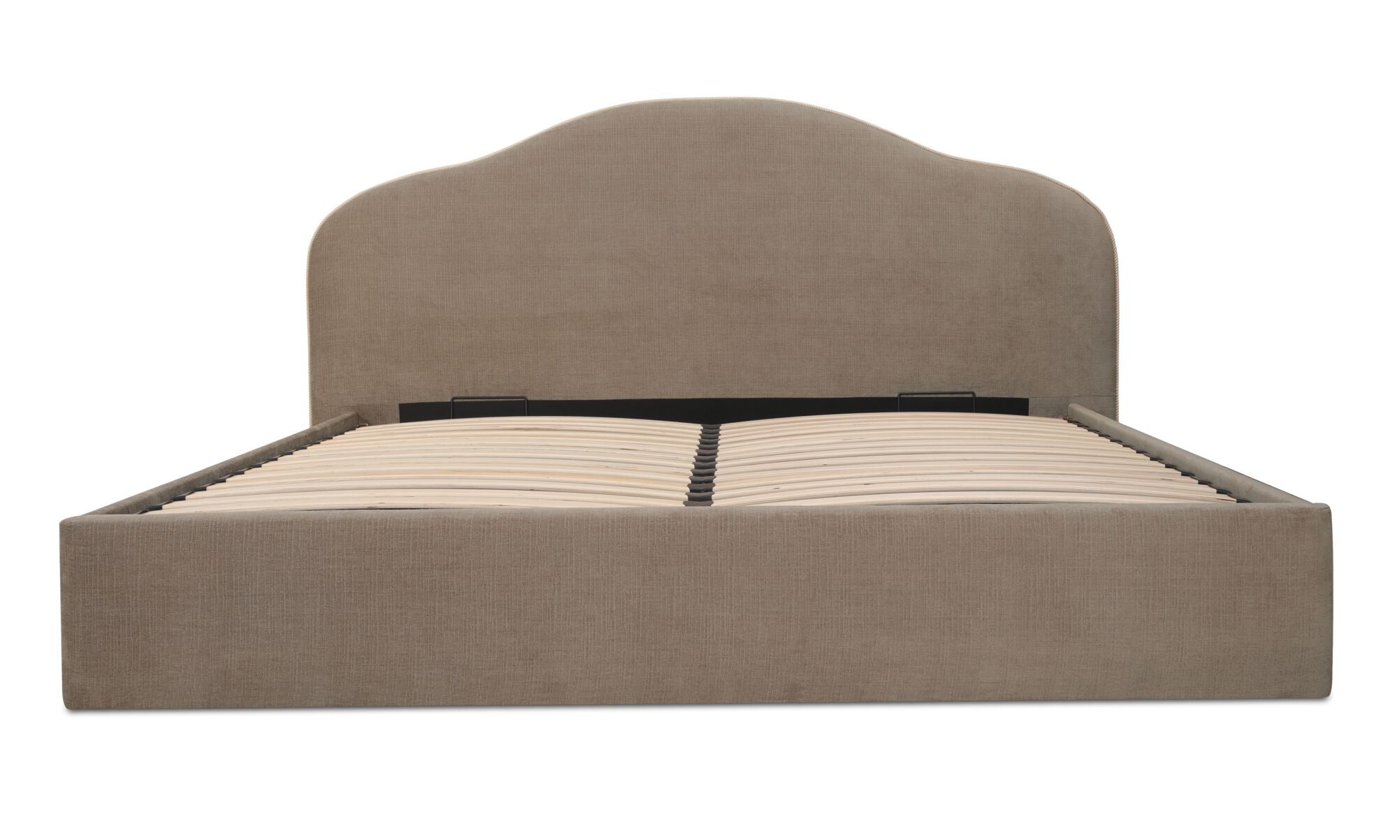 A softer take on tradition. The Orion Bed reimagines a classic arched headboard with a tapered silhouette and contrasting twisted trim for subtle detail. Upholstered in taupe or cream polyester, the rounded footboard mirrors the headboard’s softness for balance. Beneath the mattress, a hydraulic lift reveals hidden storage, showing how timeless curves can deliver everyday practicality.