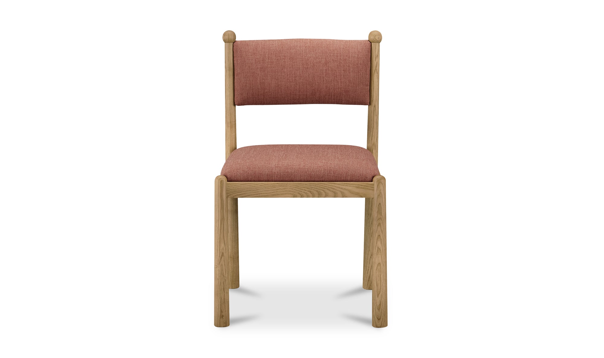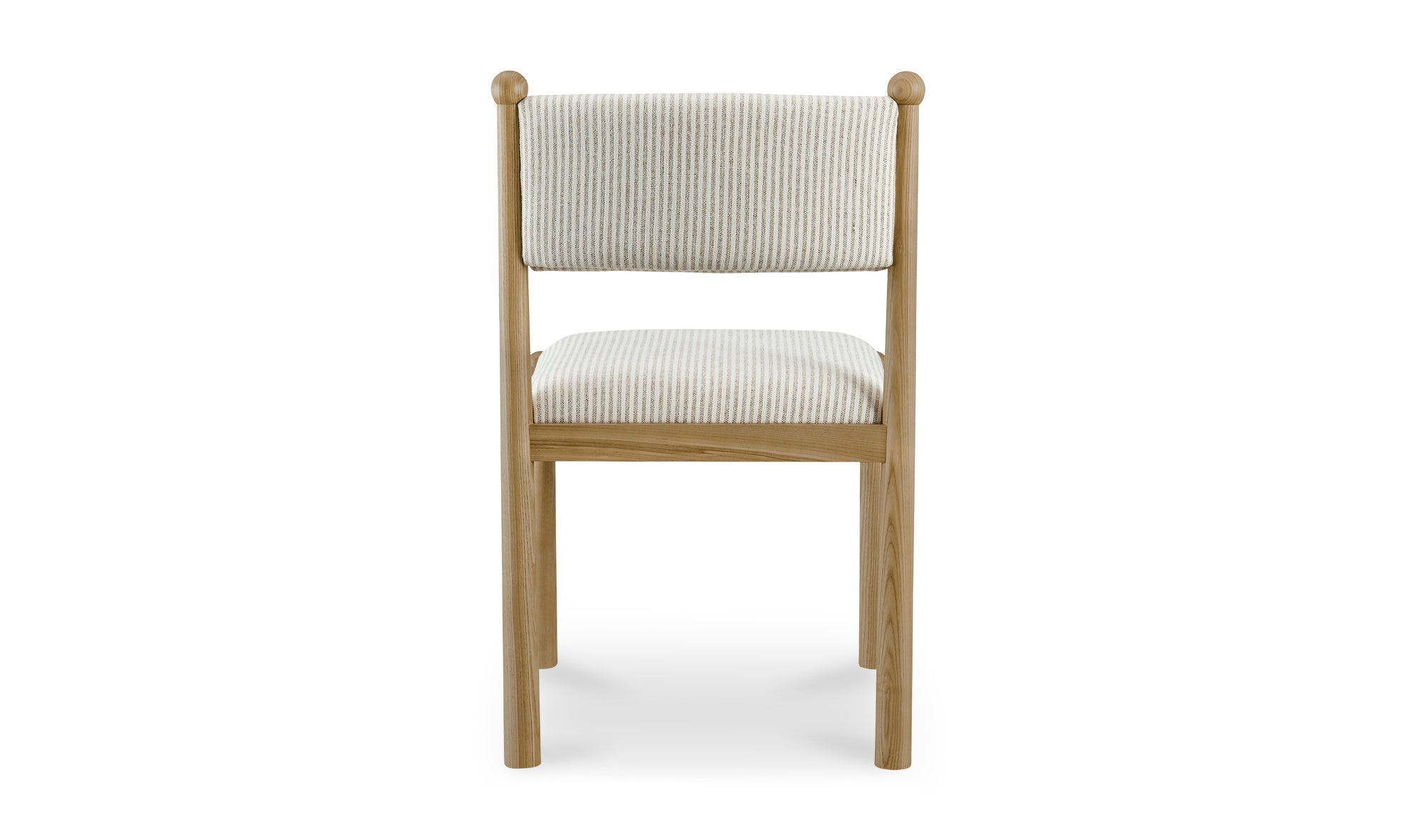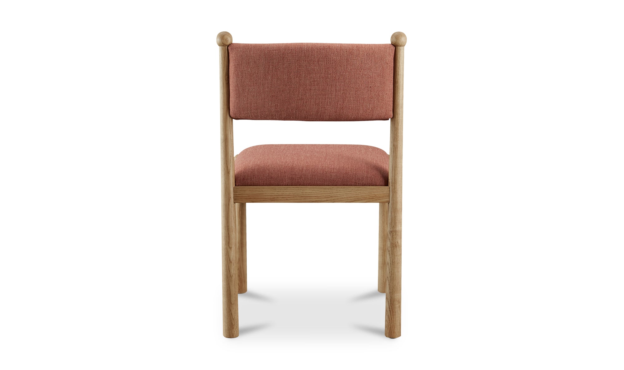 The Priscillia dining chair echoes timeless allure. Upholstered in a soft fabric, each curve tells a story of heritage and finesse. Its warm, stained frame and whimsical finial touches draw inspiration from the vintage elegance of the '60s and '70s.
